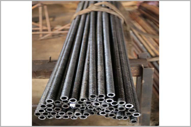 中空注漿錨桿適用于地質(zhì)條件中等,永遠性支護和超前支護通過中空桿體對錨桿進行壓力注漿,可達到固結(jié)破碎巖體,隔斷地下水及桿體防腐的目的,可迅速形成支護力,控制圍巖的穩(wěn)定。中空注漿錨桿由合金桿體、止?jié){塞、墊板、螺母和錨頭組成。桿體中孔作為鉆進高壓風水通道和注漿通道,與實心桿體相比,中空桿體設(shè)計可獲得更好的剛度和抗剪強度。
